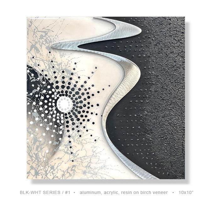This series has bold design elements, juxtaposed with the expressive use of color, textures, and dimension. Each artwork is an example of the dynamic use of negative & postive space that